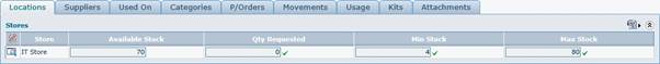 The Stores Grid shows the Store Locations, along with the available stock in that store, where the inventory item can be held.