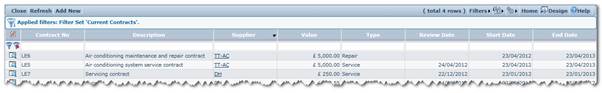 The scan form column definitions are the same as those defined on the service contracts detail form. The form is filtered by default on ‘current’ contracts, those where ‘now’ is within the start and end date defined on the contract.