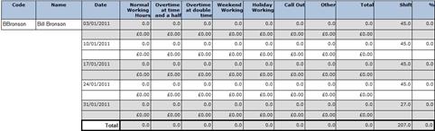 Similar to the labour utilisation report this shows the total time an employee has worked, but analysed by the pay rate, using weekly or monthly intervals. A calculation showing what percentages of the overall available hours were recorded at normal rate is also included.