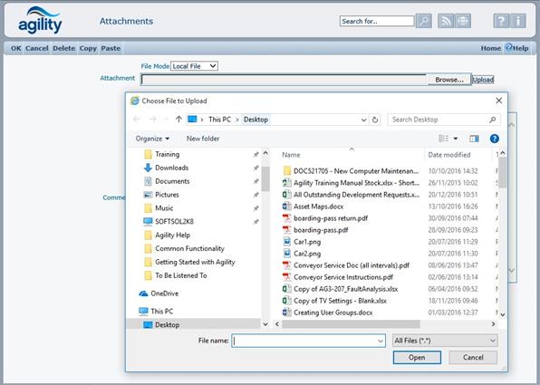 Select ‘local file’ if the document is stored or accessed from the local PC on which the session of Agility is running, a browse option is then displayed to select the appropriate document. Navigate to the file, in the same manner as opening any file in windows, click on ‘Open’ and the file path and name will be entered onto the form.