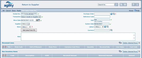 This function should be used to return stock items to a supplier and record this action in the stock control system element of Agility correctly affecting stock levels. It can be done with or without a purchase order.