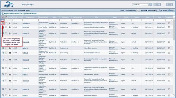 Clicking on a magnifying glass that is next to field within a detail form, will then drill down into the detail of the content of the adjacent field. For example, clicking the magnifying glass next to this ‘Equipment’ field will then show the equipment detail.