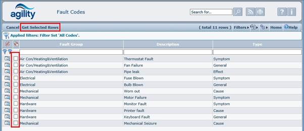To manually add faults using this form when in change mode, click the new row option at the top of the grid and select the required options from the drop down selection lists. Or alternatively, click the select from list option. This will open a multi select grid of available faults that can be selected. Click the check box of the fault(s) that need to be added to the work order using the selection check boxes.