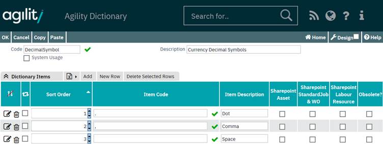 These fields describe what sign should be used to separate decimals or group of digits (thousand etc.). Values displayed in these combo box fields can be defined in system dictionaries: Currency Decimal Symbols and