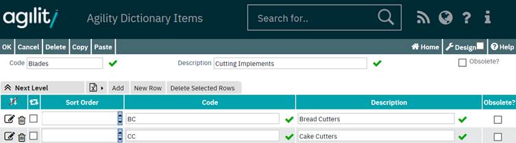 All items to be input at this level can be entered from this grid. To add a list below one of these options, click on the detail icon to go into the detail of that item.
